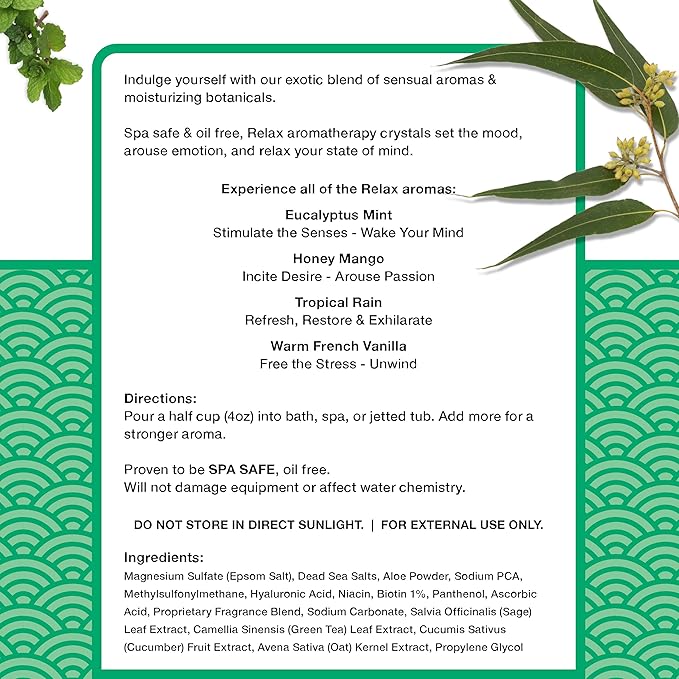 - MADE IN THE USA WITH QUALITY GUARANTEE: Relax Spa & Bath is proudly crafted in the U.S.A. with all-natural ingredients, our epsom salt bath soak comes with a satisfaction guarantee for your peace of mind.