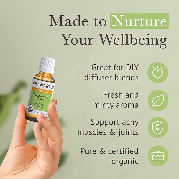 Pranarom USDA Certified Organic Peppermint Essential Oil (30ml), 100% Pure Undiluted Therapeutic Grade from India for Aromatherapy, Diffuser, Topical, Cooling, Massage & Relaxation