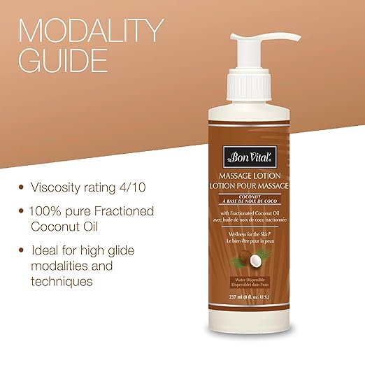 - Lightweight massage lotion made with 100% pure Fractionated Coconut Oil helps you achieve a more enhanced, soothing massage and provides countless skin nutrient benefits and intensive hydration for dry skin