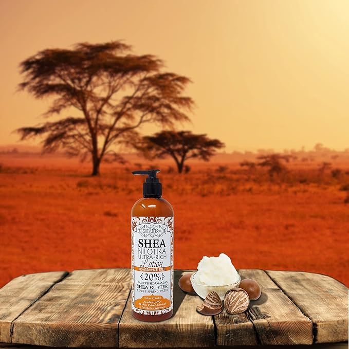 - 20 Percent Nilotik Shea Butter: Unlike other lotions which contain only 5 percent shea butter, 20 percent virgin cold pressed and non-deodorized Ugandan shea butter goes into our rich, creamy lotion making it effective in softening & protecting skin.