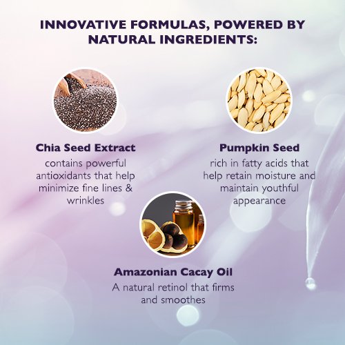 - Chia Seed Oil, Pumpkin Seed, Amazonian Cacay Oil and Grapeseed Oil protect skin from aging