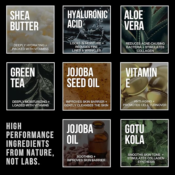- π΄ CLEAN INGREDIENTS: Made in the USA with potent vitamins, antioxidants, and a half-dozen nourishing peptides, fuel your skin from within. Packed with Botanical Hyaluronic Acid, Organic Aloe Vera, Organic Jojoba Oil, Vitamin E + B5, and Shea Butter.