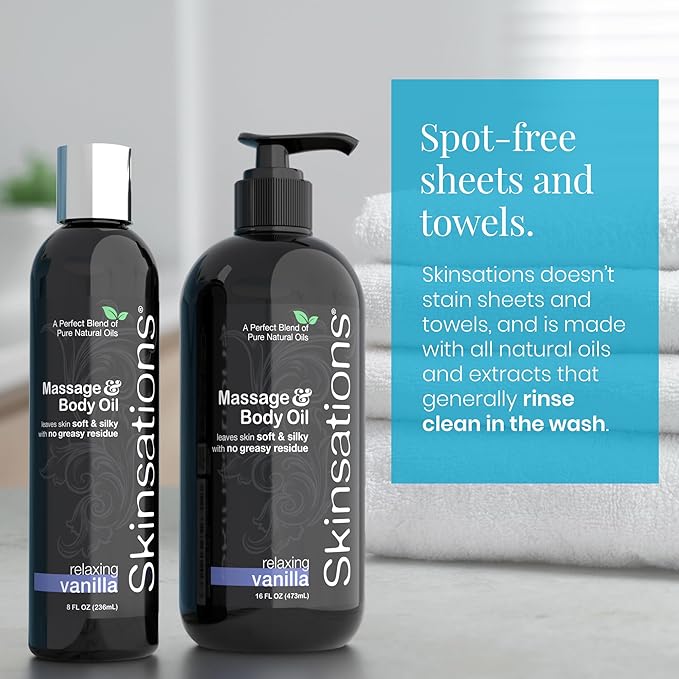 - Made and packaged in the USA – Money-back Guarantee! Skinsations is a natural massage oil, scented body oil and after shower oil moisturizer all-in-one!