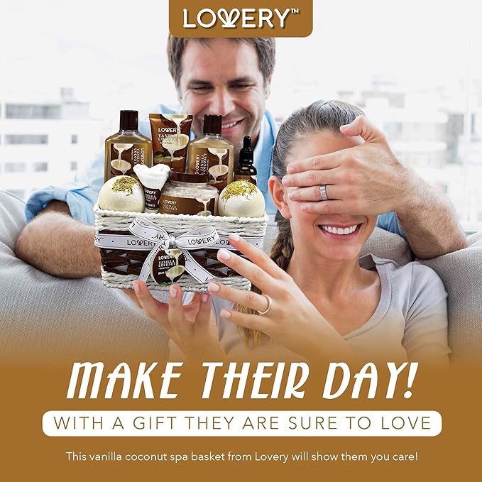 Bath and Body Gift Basket For Women and Men – 9 Piece Set of Vanilla Coconut Home Spa Set, Includes Fragrant Lotions, Extra Large Bath Bombs, Coconut Oil, Luxurious Bath Towel & More