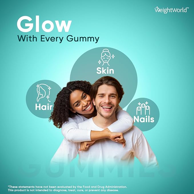 - BIOTIN GUMMIES FOR HAIR, SKIN & NAILS - Elevate your beauty routine with WeightWorld's Biotin Gummies. Each serving offers 5000mcg of biotin to nourish your hair, skin & nails. Maintaining a healthy appearance can become more difficult as we age or change our diet. Biotin Supplements support both men and women in achieving radiant, youthful skin. They also support nails to gain strength naturally & hair to regain their natural shine.