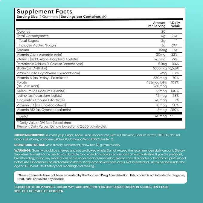 - ADDED VITAMINS, MINERALS & OTHER NUTRIENTS - Our biotin gummies are a blend of essential vitamins like A, C, E, B12, B6, and D3, all working synergistically for effective results. Added minerals like sodium, selenium, and iodine keep the body hydrated. Powerful nutrients like choline and inositol support your body's natural defenses, helping you look and feel your finest. These hand-picked nutrients make you feel beautiful from the inside out.