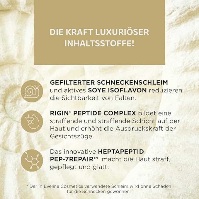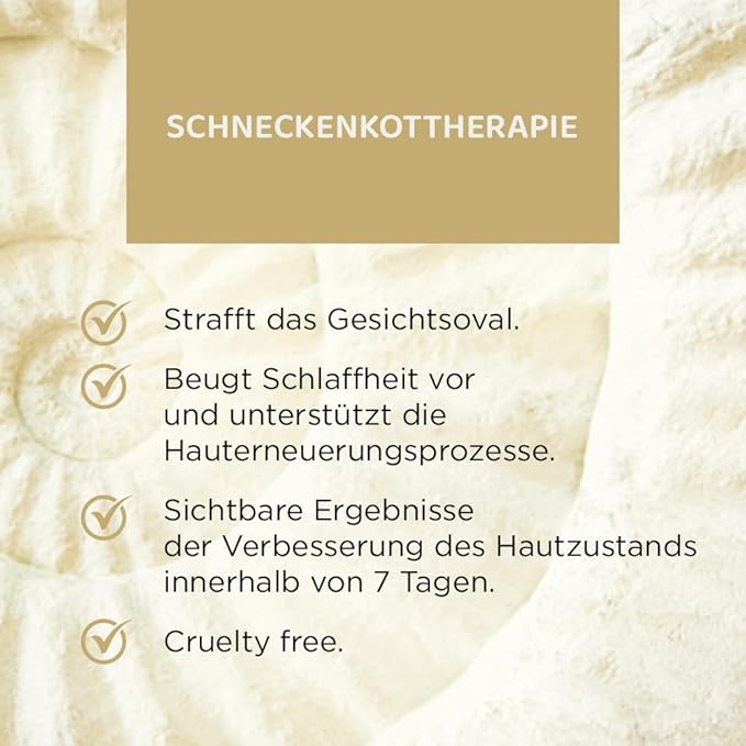 - Snail slime filtrate combined with active soy isoflavones reduces visibility of wrinkles and furrows, intensely smoothes the skin, ensuring increase in its tension and elasticity
