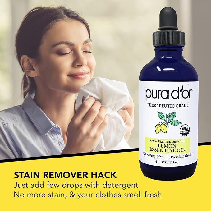 PURA D'OR Organic Lemon Essential Oil (4oz with Glass Dropper) USDA Certified 100% Pure & Natural Therapeutic Grade Diffuser Oil Citrus Scented for Aromatherapy, Mood Uplift, Energy, Focus