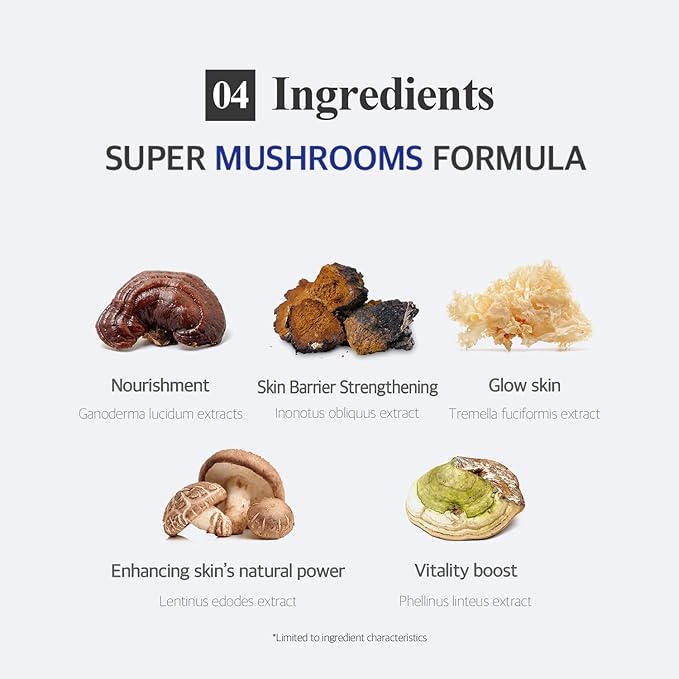 - Super Mushroom Eye Mask : Enriched with a powerful blend of five mushrooms and beta-glucan, deeply hydrates and firms the delicate eye area, leaving it nourished and revitalized.