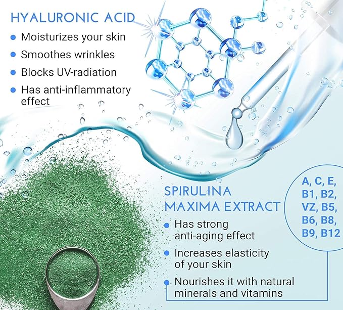 - ALGAE FACIAL MASK SHEET - With SPIRULINA MAXIMA, our skin care products help reduce wrinkles, increase skin elasticity, restore natural functioning, alleviate inflammation, and regenerate skin cells.
