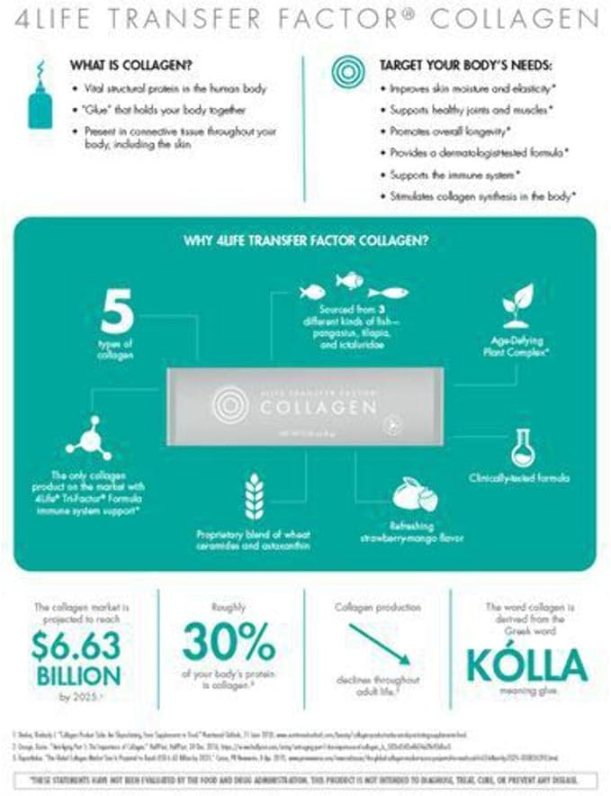 - Formula that features five types of collagen; 4Life Transfer Factor; vitamins A, C, and E; biotin; and our Age-Defying Plant Complex