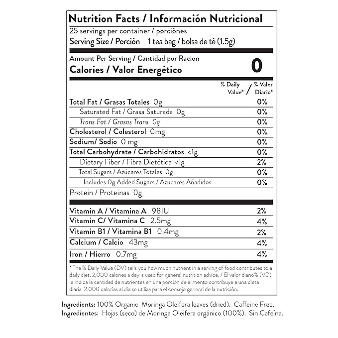 - YOUR PATH TO WELLNESS BY MIRACLE TREE: Our mission is to help people discover superfoods and promote healthier lifestyle choices. An affordable and high-quality herbal tea, you are sure to be satisfied. In addition to being organic, our moringa teas are 100% vegan, gluten-free, Non-GMO and completely sugar-free! Most blends are caffeine free, with the exception of Green Tea and Earl Grey. Our tea bags are completely plastic-free. Start your path to wellness -- and discover Miracle Tree!