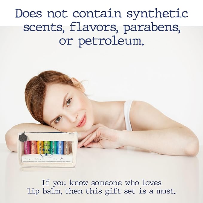 - ALL NATURAL - The lip balms in this gift set are made of natural ingredients like bees wax, olive oil, cocoa butter, sunflower oil, almond oil, apricot kernel oil, grape seed oil, and hemp seed oil.