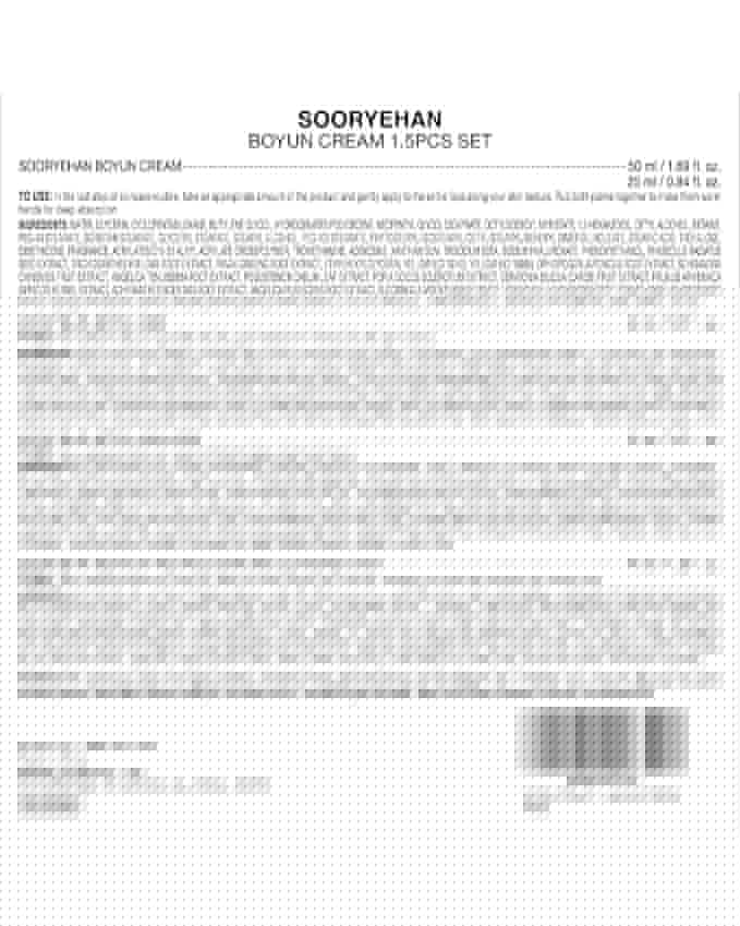 - SOORYEHAN BOYUN CREAM SKINCARE SET (155ml/5.2fl oz) - Elevate your skincare experience with our deluxe set, showcasing the lavish Boyun Cream in 2 sizes (50ml/1.7fl oz + 25ml/0.8fl oz). This collection also includes travel-sized versions of Boyun Emulsion (20ml/0.7fl oz), Boyun Toner (20ml/0.7fl oz), and Ginseng Cleansing Foam (40ml/1.4fl oz).