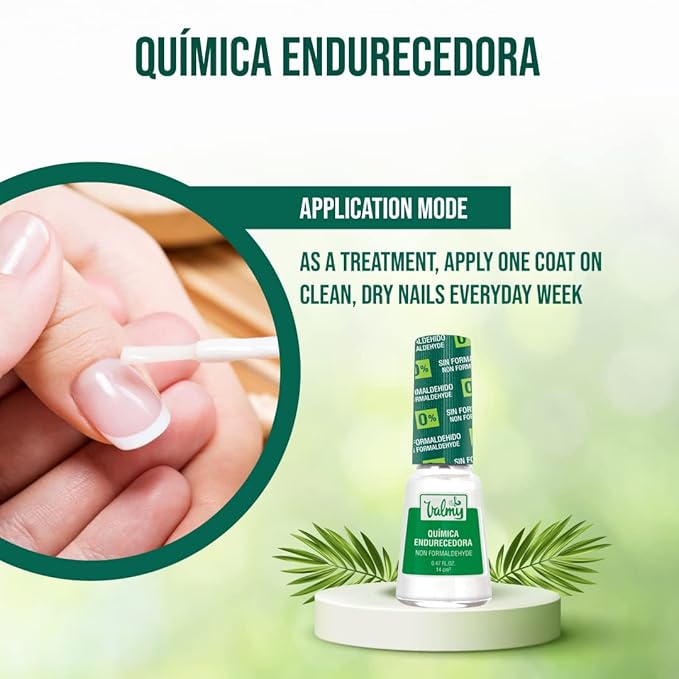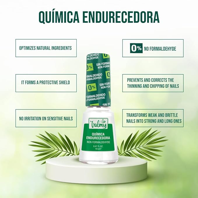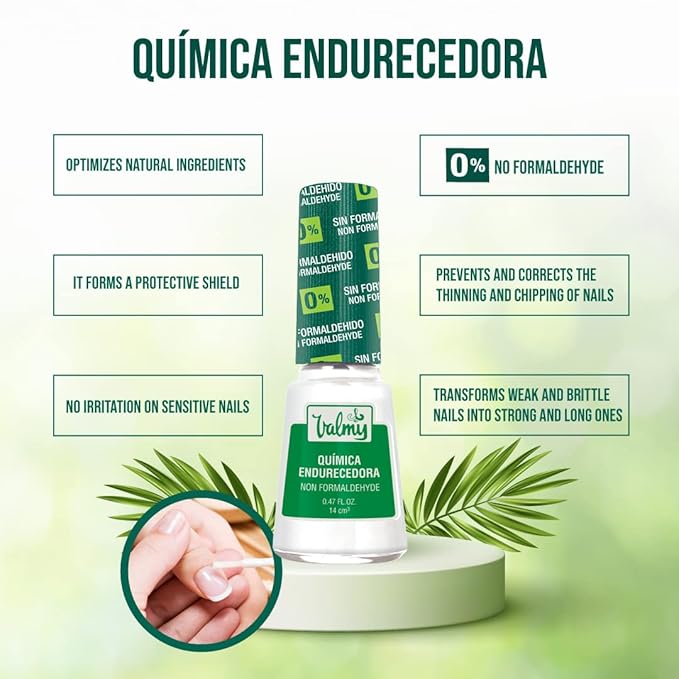 - ๐ FORMALDEHYDE-FREE HARDENER: Our Valmy Quรญmica Endurecedora is specially formulated with a formaldehyde-free treatment that provides a protective barrier to your nails. This barrier strengthens and transforms your nails, improving their condition and protecting them from external aggressors that can cause damage.๐