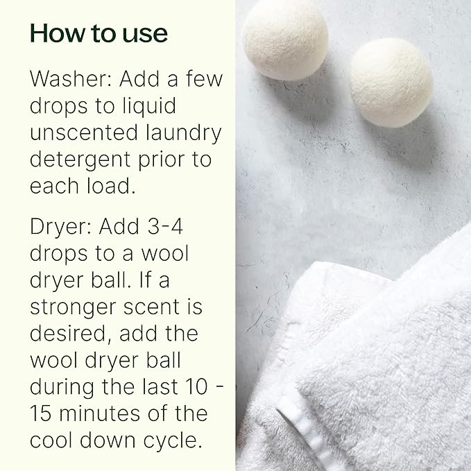 - PAIR WITH UNSCENTED DETERGENT OR DRYER BALLS: When adding to your wash cycle, add a few drops of your chosen to liquid unscented laundry detergent prior to each load. When using with a dryer, add 3-4 drops to a wool dryer ball and toss the balls into the dryer. Or if a stronger scent is desired, add 3-4 drops to a wool dryer ball during the last 10 - 15 minutes of the cool down cycle.