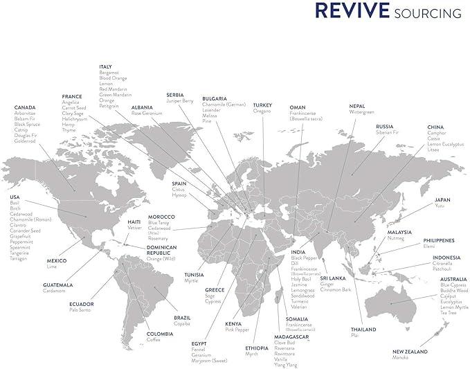 - Quality starts with Farms and Sourcing. REVIVE Essential Oils are sourced from around the world, from the specific regions of the world where that species of plant or tree grows best.