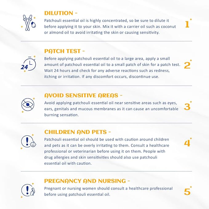 • Multiple Blend: Patchouli essential oil can be blended with Juniper Berry, Bergamot, Black Pepper, Ginger, Sage, Rose, Myrrh, Lemongrass, Frankincense, Pine, Sandalwood, Geranium, Lavender, Ylang-Ylang essential oils. Dilute with carrier oil before use. Test on feet first for skin sensitivity prior to widespread use