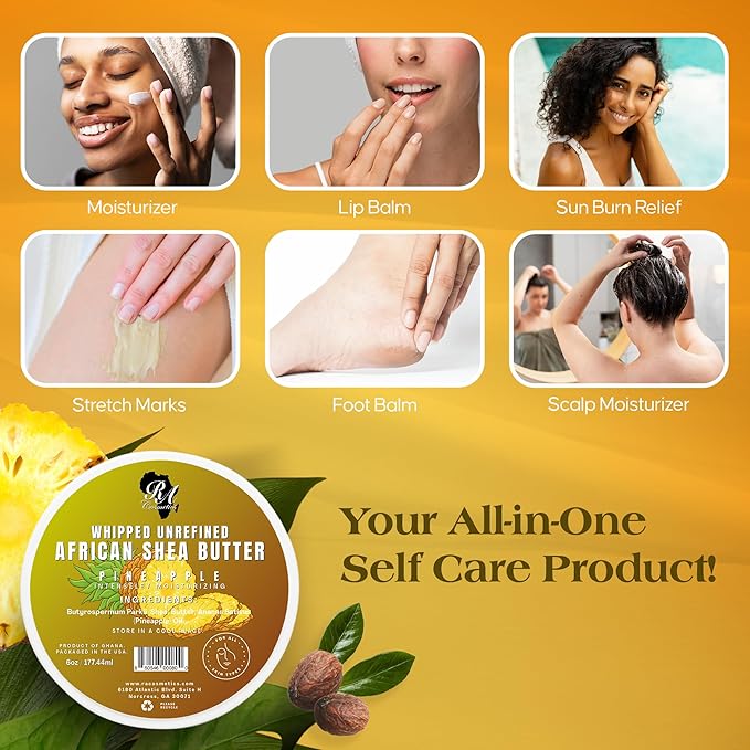- Tropical Bliss with Pineapple Infusion: Immerse yourself in the exotic aroma of pineapple with this specially crafted whipped shea butter. The infusion adds a delightful tropical twist to your skincare routine, making it not just a beauty essential but also a treat for your senses.