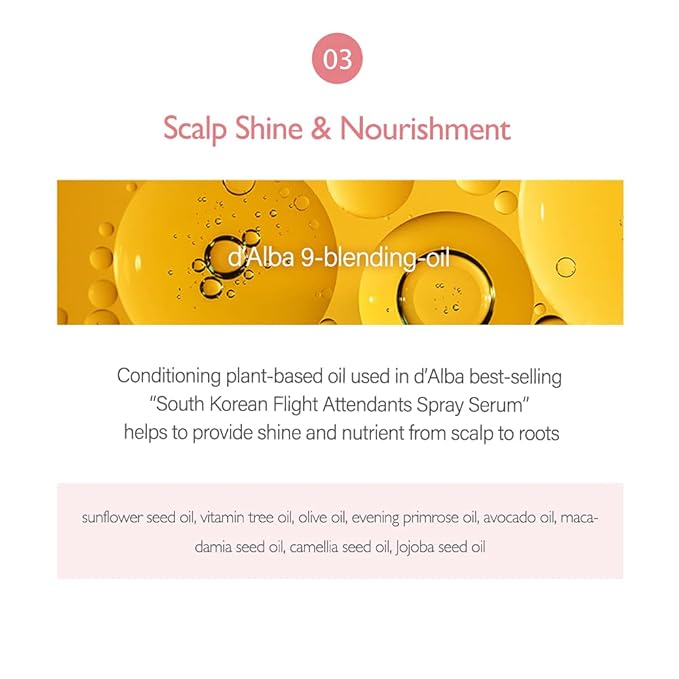 - The mixture of silk extract, hydrolyzed keratin, d’Alba-9 blending oil, tocopherol, and patented amino acid complex etc. provides deep nourishment and protection to the scalp and hair.