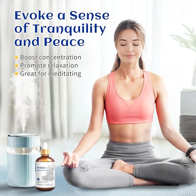 - Diffuser: Add 2-3 drops of Myrrh essential oil to a diffuser for a calming aroma. Tips: Blending with Frankincense essential oil may enhance the fragrance experience