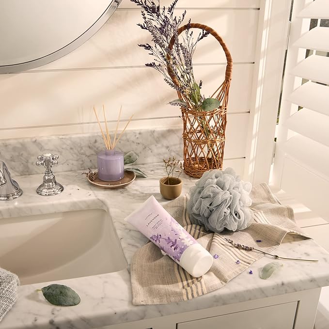- Thymes Lavender Body Scrub: A soothing, exfoliating body scrub infused with hydration-boosting sodium hyaluronate and argan shell powder that gently cleanses to reveal soft, renewed skin while argan oil soothes and moisturizes.