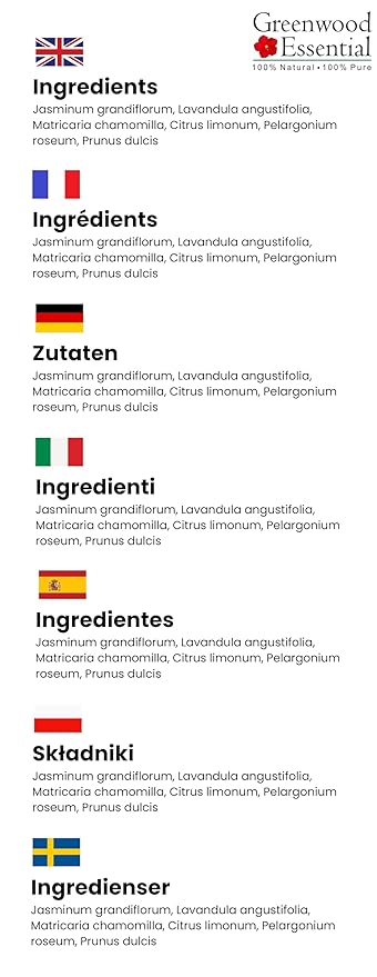 - Ingredients: Pure Jasmine Essential Oil (Jasminum grandiflorum), Pure German Chamomile Essential Oil (Matricaria recutita), Pure Rose Geranium Essential Oil (Pelargonium roseum), Pure French Lavender Essential Oil (Lavandula angustifolia), Pure Lemon Essential Oil (Citrus limonum)