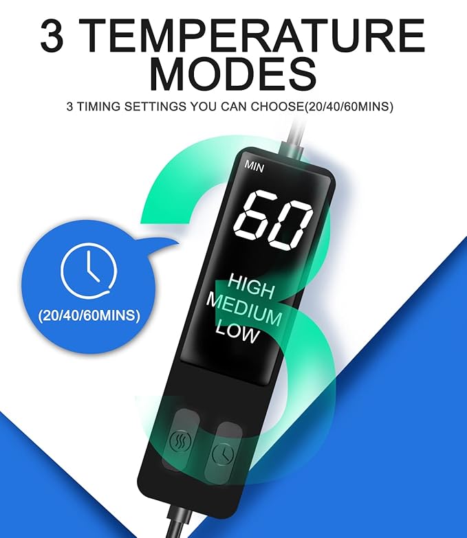 - The electrical heated eye mask was specially designed to have 3-class heat temperature settings from 104℉ to 140℉ and timing settings(20, 40 or 60 minutes). It will stop working automatically when time is up