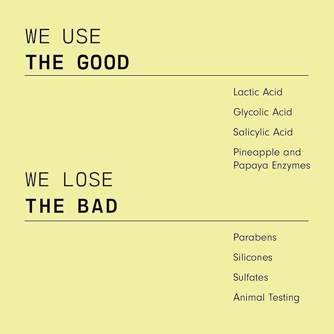 - Buildable Brightness - This instant glow is all thanks to vitamin C rich pineapple and papaya enzymes, which gently remove the outer layer of dead skin cells that trap bacteria, while moisturizing and softening skin. The best part? Watching the results build week after week.