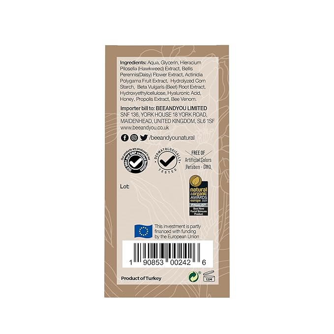 - POWERFUL 100% NATURAL FORMULA: A tried and tested formula that works, with a combination of Aqua, Glycerin, Hawkweed Extract, Daisy Flower Extract, Kiwifruit Extract, Corn Starch, Beet Root Extract, Hyaluronic Acid, Honey, Bee Propolis Extract, Bee Venom. Made in Türkiye.