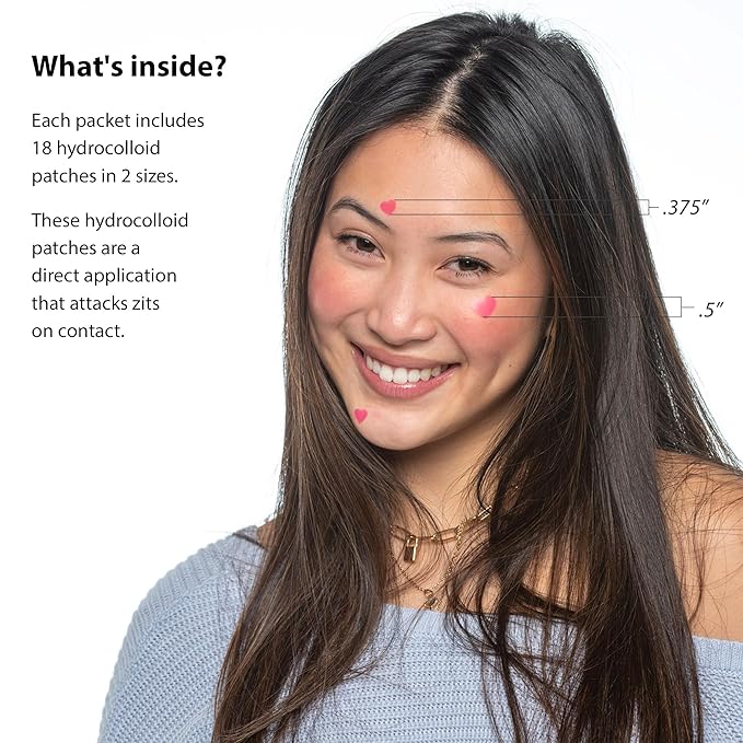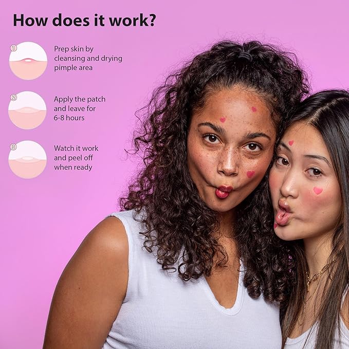 - HANDS OFF YOUR PIMPLES!: Send your zits packing without picking! Our stylish heart-shaped hydrocolloid patches are available in two sizes to beat breakouts and pamper your skin without harsh chemicals or drying ingredients. Brilliant!