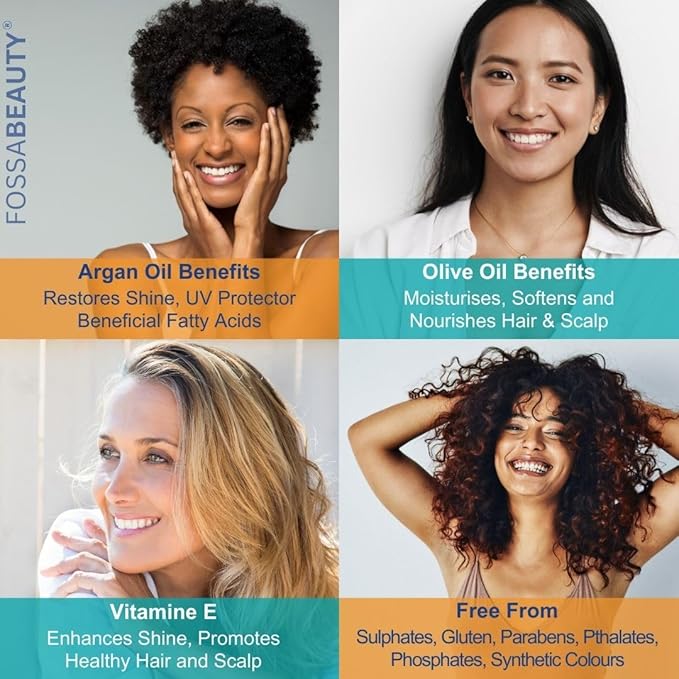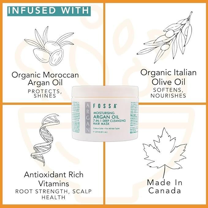 - HAIR REPAIR FOR ALL TYPES: Fossa's Moisturising Argan Oil 7-in-1 Deep Cleansing Hair Mask provides healing treatment for all hair types and is colour safe. The beneficial fatty acids of the organic argan oil can help increase your hair's elasticity. The organic olive oil boosts moisture, strengthens roots, and can help reduce damage and split ends. The hair mask provides a deep cleaning and intensive conditioning without tangles, frizz, or colour fade.