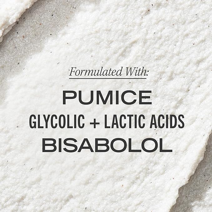 - Buff Away Dead Skin: Glycolic & Lactic acids, at a combined level of 10% AHAs, to help resurface skin’s top layer + pumice to physically exfoliate, helping improve skin’s texture and smooth away bumps, roughness, and scaly areas, also known as chicken skin + buttne