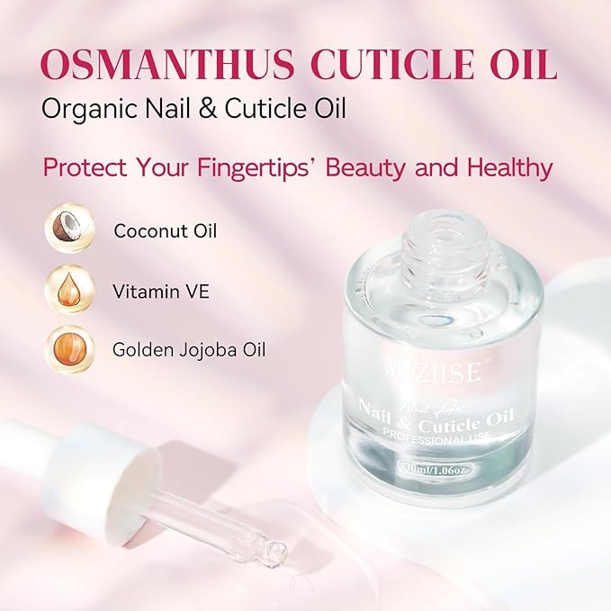 - Organic Cuticle Oil: MIZHSE Organic nail cuticle oil is enriched with coconut oil, vitamin A+E, and golden jojoba oil. Lightly scented with osmanthus, soothing to your emotions. Applying cuticle oil on the nails can nourish and hydrate the skin around your nails, prevent dryness, cracking, and irritation, and get stunning shiny nails that are comfortable and healthy