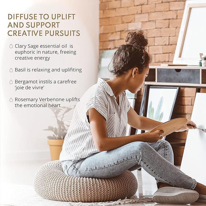 - About the oils: Clary Sage essential oil is euphoric in nature, freeing creative energy; Basil is relaxing and uplifting; Bergamot instills a carefree ‘joie de vivre’; and Rosemary Verbenone uplifts the emotional heart.