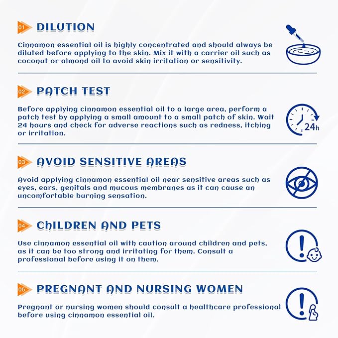 • Multiple Use Scenarios: Add 1-2 drops of cinnamon essential oil to your diffuser to eliminate odors. It is also great for kitchens, showers, bathtubs, toilets, cars, air freshening, offices, bedrooms, yoga, saunas, spas, aromatherapy and outdoor spaces