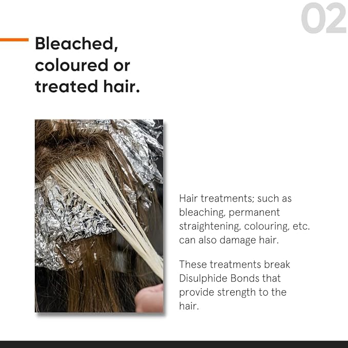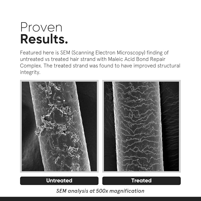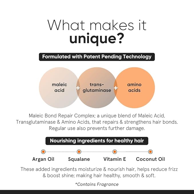 - [ PATENT PENDING BOND REPAIR HAIR SERUM ]: A new Patent Pending combination of Maleic Acid, Tranglutaminase and Amino Acids in potent concentration of 5% that repairs weak and damaged hair bonds (caused by UV exposure, heat styling, coloring, & treatment like straightening) and protects hair from further damages. Pre shampoo usage.