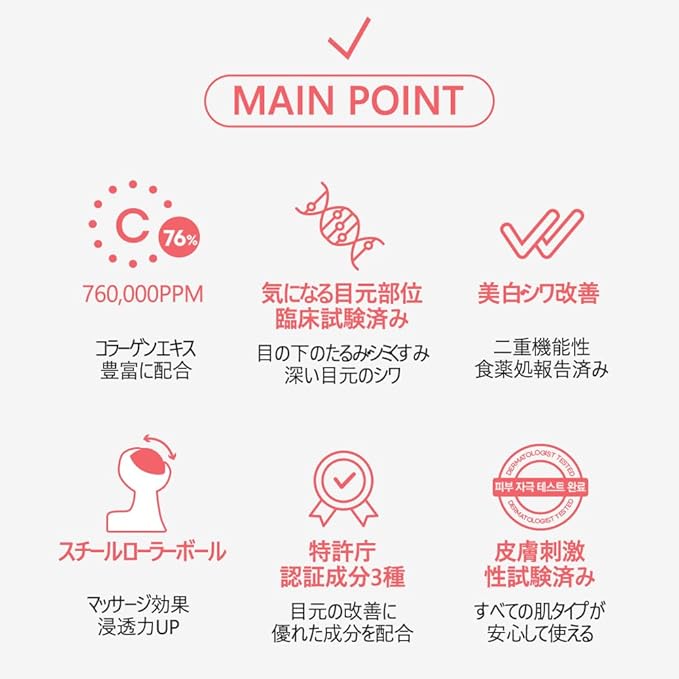 - An eye serum that nourishes and moisturizes the skin to make it firm and smooth with 76% Hydrolyzed Collagen Extract instead of purified water.