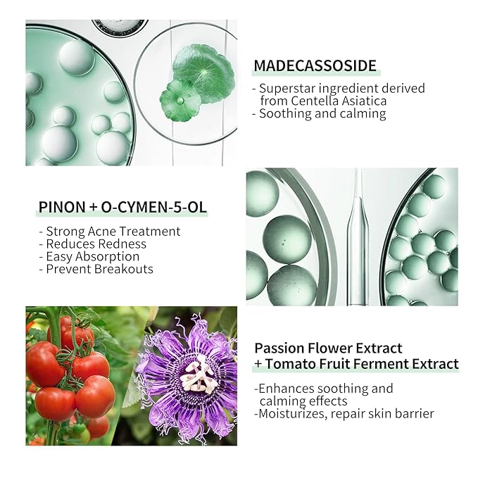 - 🌿【Superior Acne Relief】PIONIN(Polyquaternium-73) and o-CYMEN-5-OL can relieve redess and swelling of acne-prone face skin, are easily absorbed and prevent breakout.It is also paired with more than 10 kinds of natural healing acne plants that greatly improve acne without irritating the skin and is suitable for acne prone sensitive skin.