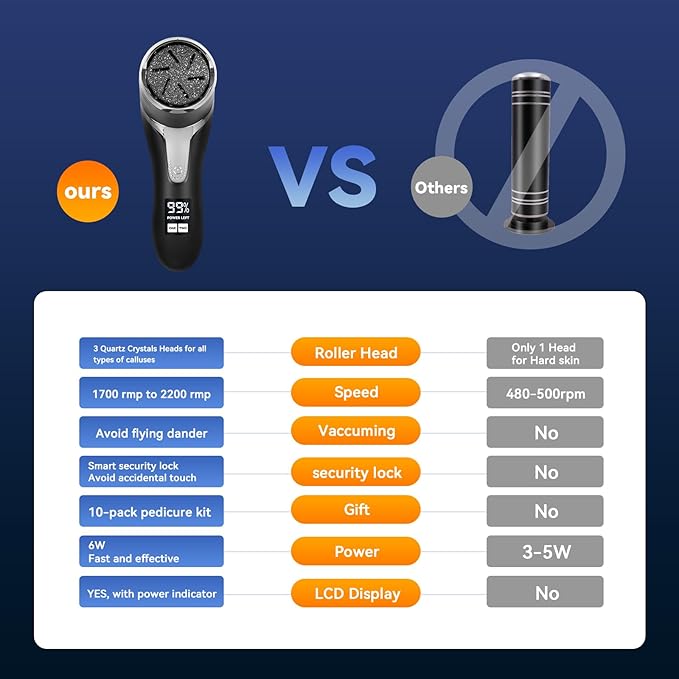 - 【Powerful Electric Callus Remover with Vacuum】Built in 2 powerful 6W motors, this foot callus remover can provide 2200RPM and achieve faster removal of hard dead skin. With a unique vacuum design, this callus remover can quickly remove foot debris or dead skin without worrying about getting the floor dirty when grinding feet, which is very user-friendly and practical.