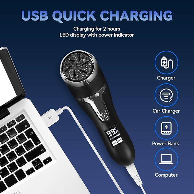 - 【Rechargeable and LCD Display】Built-in 1200mAh large-capacity lithium battery, this electric callus remover can be charged via any USB port, which can fully charge in just 2 hours. The LCD power display allows you to clearly know the remaining battery level, reminds you to charge in a timely manner, and also allows you to see the selected speed more clearly.