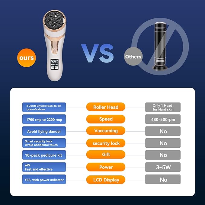• 【3 Grinding Heads and 2 Speed Adjustable】Our callus remover for feet electric is equipped with three quartz crystal roller heads, which can be quickly replaced to meet the removal needs of different calluses or dead skin. The 2-speed adjustable design provides a more comfortable foot care experience. The foot callus remover has 2 speeds: 1700x/min at low speed and 2200x/min at high speed.