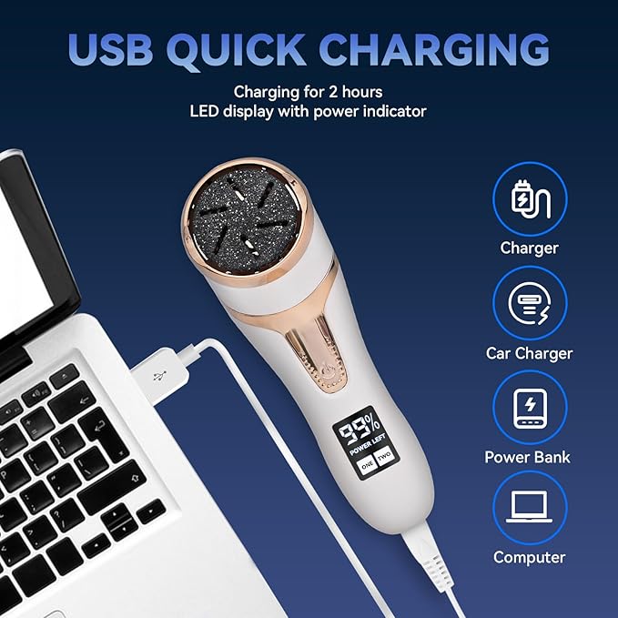 • 【Rechargeable and LCD Display】Built-in 1200mAh large-capacity lithium battery, this electric callus remover can be charged via any USB port, which can fully charge in just 2 hours. The LCD power display allows you to clearly know the remaining battery level, reminds you to charge in a timely manner, and also allows you to see the selected speed more clearly.