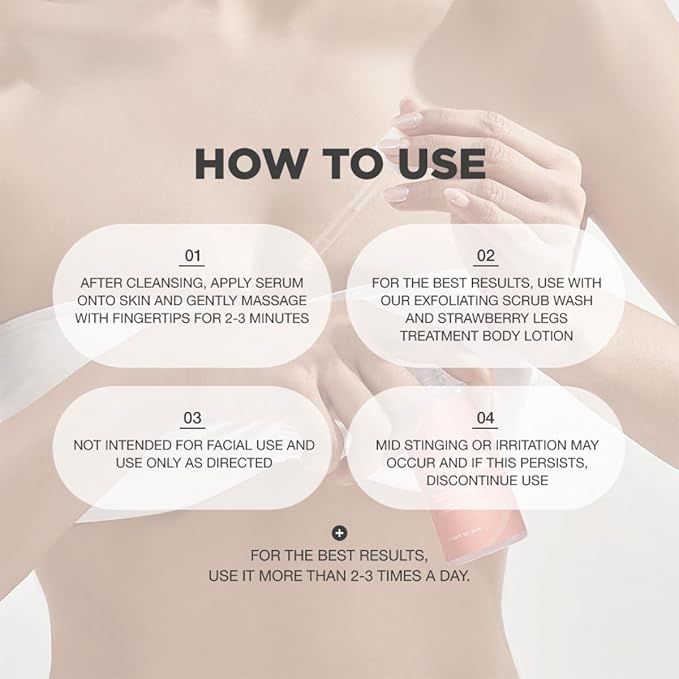 - STRAWBERRY LEGS TREATMENT FOR ALL SKIN TYPE – Formulated for strawberry skin treatment, keratosis pilaris treatment, chicken skin treatment and other body bumps, our Exfoliating Body Serum for Strawberry Skin Treatment works fast and effective. Our proprietary skin reviving and smoothing strawberry legs treatment for women formula penetrates deep into your skin to target strawberry legs, strawberry skin and keratosis pilaris to smooths skin without irritating unconcerned areas.