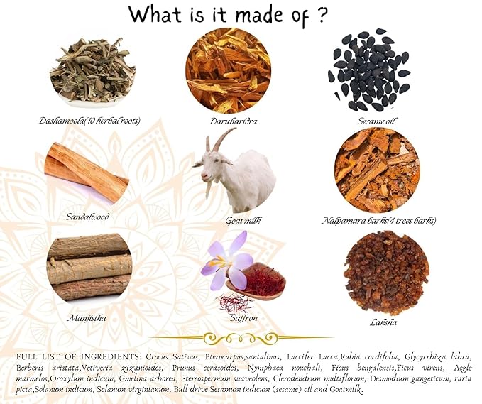 - VARNYAKARA INGREDIENTS : Our Kumkumadi Taila blends saffron, sandalwood, lotus, licorice, laksha, Bilwa roots, goat milk, and 19 VARNYAKARA (complexion-enhancing) herbs. Its rich golden hue and calming saffron aroma make it a luxurious treat for your skin. You're sure to love this beauty elixir!