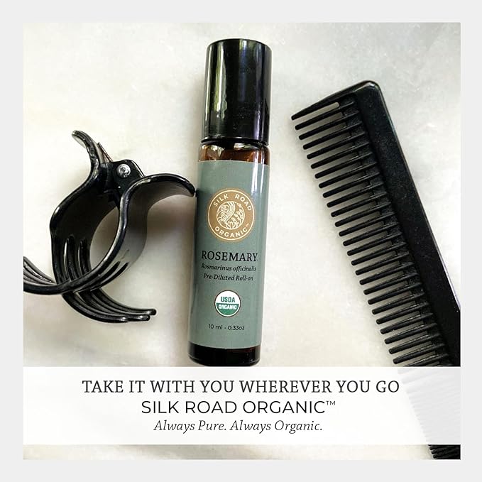 Silk Road Organic Rosemary Essential Oil & Jojoba Roll On, 100% Pure USDA Certified Aromatherapy to Improve Memory & Focus & Hair Health - 10 ml Roller
