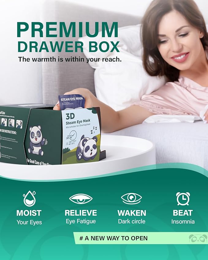 - 【Advanced 3D Visible Eye Patch】Our panda steam eye mask allows you to wear at anymoments & anywhere. Evenly warms around your eyes, avoid the eyeballs.