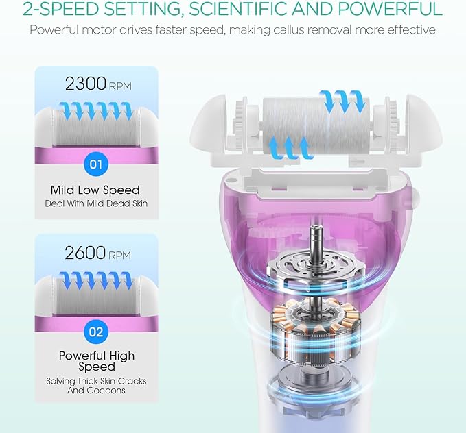 - Efficient & Comfortable, Safer - Powerful power drive can reach the scientific and fast speed of 2600rpm/s, makes it easier and more comfortable for you to remove dead skin and calluses on your heels. And VOYOR electric foot file has a safety mechanism: if excessive pressure is applied to the head, it will stop automatically, thus preventing injury.