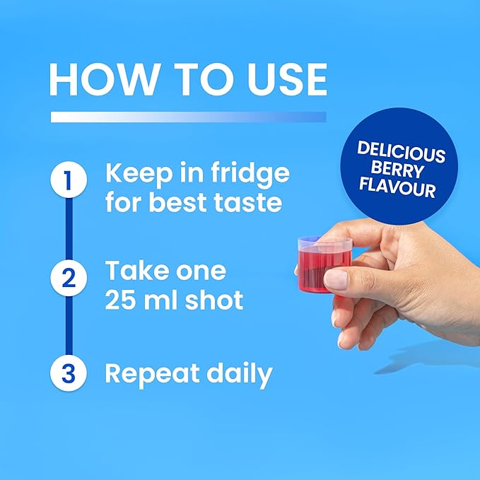 - 20-DAY SUPPLY: One 500 ml bottle for a 20-day supply with a 25 ml daily dose; it comes in a delicious Natural Berry flavored shot and is sugar-free, with 100% natural flavor and color; keep refrigerated for optimum taste; made with 100% recyclable packaging
