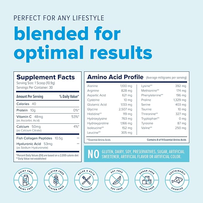 - Special Blend of Vitamins & Minerals: In addition to marine collagen peptides, this specially developed formula is complete with the added benefits of Vitamin C, a powerful antioxidant that supports growth and repair of all body tissues, Hyaluronic Acid to assist in supporting skin hydration and elasticity, and Calcium to support healthy bones and joints.